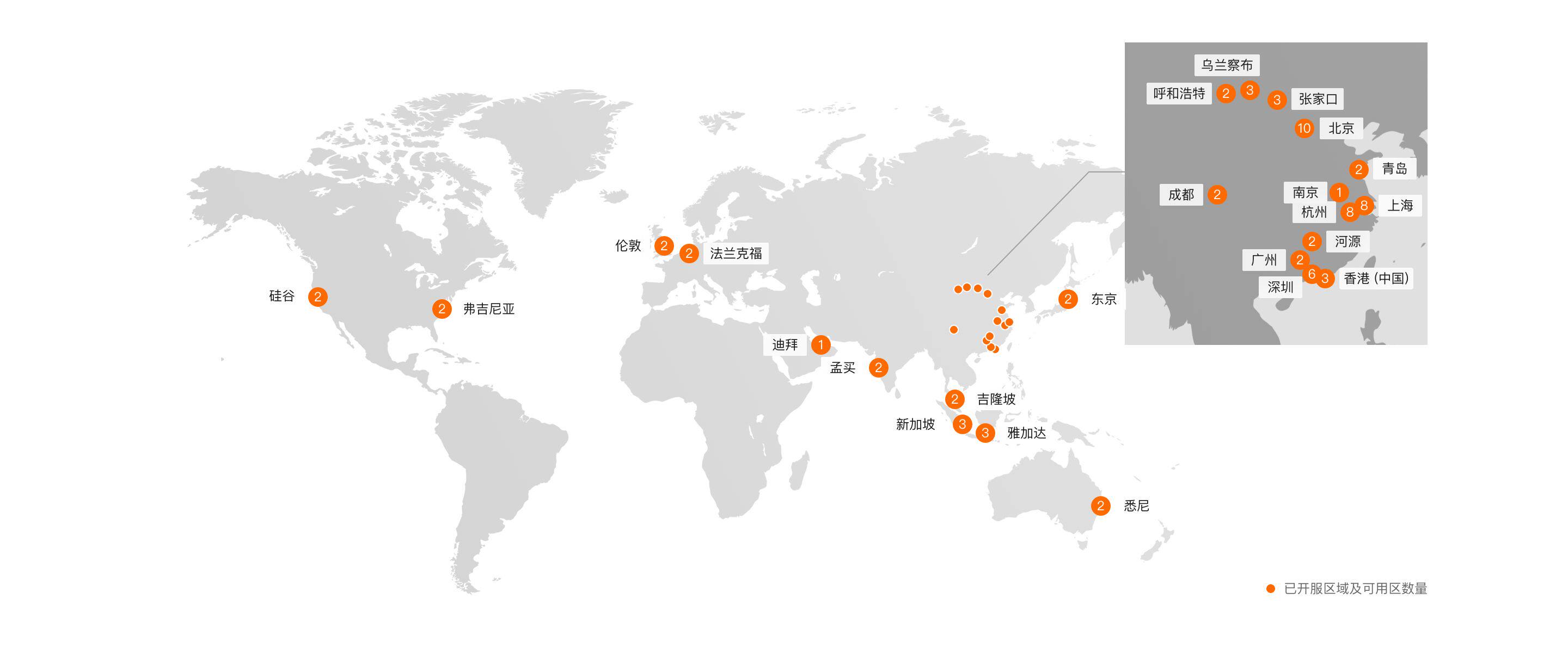 阿里云在全球24个地域开放了75个可用区,为全球数十亿用户提供可靠的计算支持。