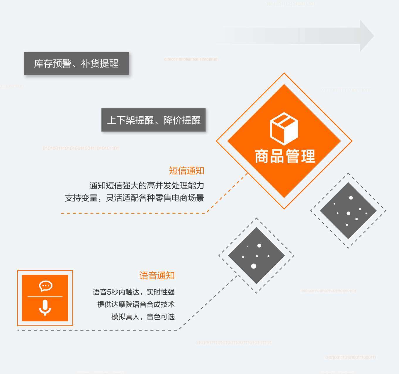 通过短信通知提醒买家新品上架、商品降价提醒,提醒卖家库存不足及时补货。库存预警等重要通知可通过语音触达,接通率高、消息不遗漏。