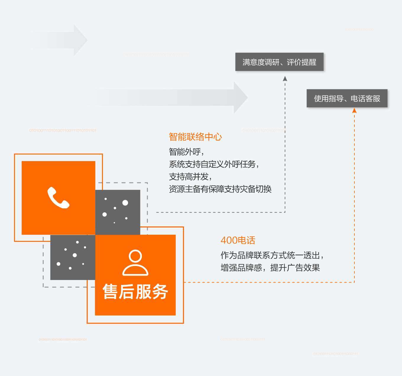 满意度调研、评价提醒、使用指导、电话客服