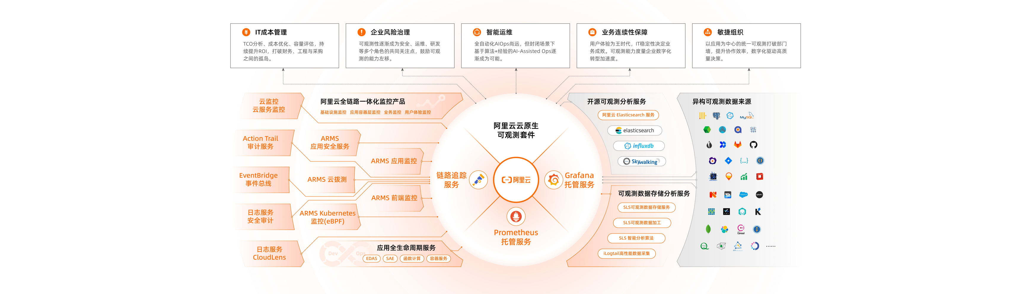 阿里云云原生可观测套件围绕Prometheus服务、Grafana服务和链路追踪服务,