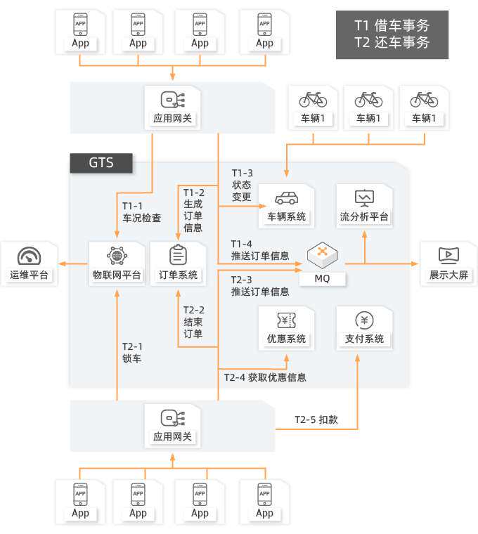 共享出行场景下,通过GTS支撑物联网系统、订单系统、支付系统、运维系统、分析系统等系各统应用事务一致性,保证海量订单和数千万流水的交易。