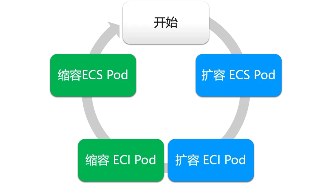 但从弹性供给来看,ECI 并不能完全保证资源的供给,结合常态下的使用情况,当前采取混合部署模式,兼顾成本及稳定性两方面的业务目标。如图所示,常态业务下使用 ECS 资源,在有突发业务流量的时候,通过 ECI 按需提供资源。