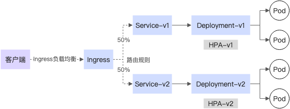 在 K8s 中如果要做基于流量的蓝绿发布,首先需要创建对应的 K8s Service 与 Deployment,如果需要弹性,则还需要配置 HPA,然后在流量灰度发布时,要创建新的版本,最后通过 Ingress 设置对应的流量比例,最终实现流量灰度发布的功能。显然,在 K8s 要做基于流量的蓝绿发布,需要管理多种资源,并且随着版本的迭代,管理起来会更加复杂。