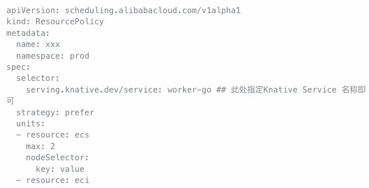 对于不同类型的节点需通过打上不同节点标签实现,然后创建 ResourcePolicy 自定义节点池调度顺序。结合 Knative,只需要在 selector 指定相应的 Knative Service 名称即可。ResourcePolicy 配置示例如下: