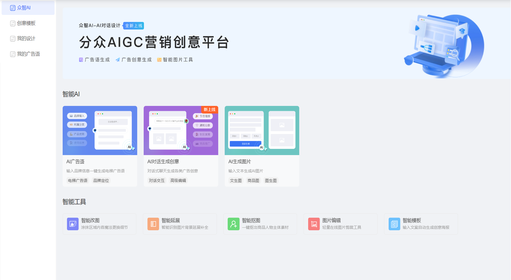 AI 创意设计是一个基于分众广告海报和视频案例,基于 AIGC 的多模态能力进行批量高效的广告图生成、设计、编辑的系列应用;专注 B 端广告营销场景的 AI 生图能力;支持强大易用的二次图文视频混排及配音配乐。