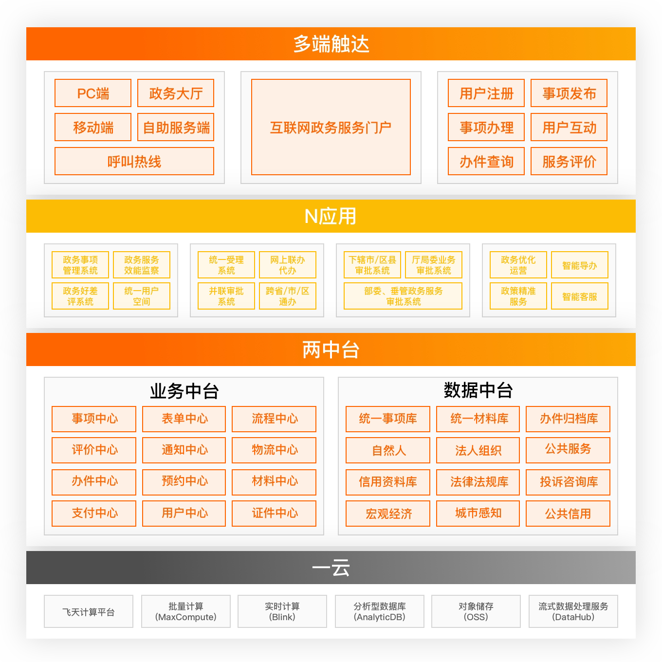 支持政务服务的多端协同、智能导服、事项快速上线,与已有政府办事系统无缝对接,构建真正以企业/群众体验为中心的政务服务模式,让企业/群众办事跟在淘宝购物一样方便。