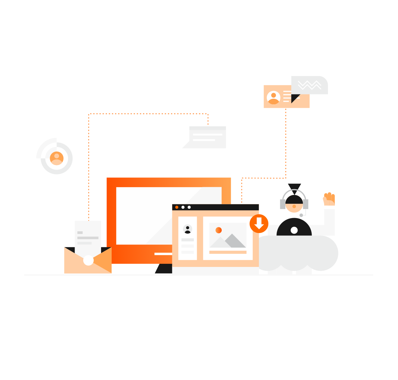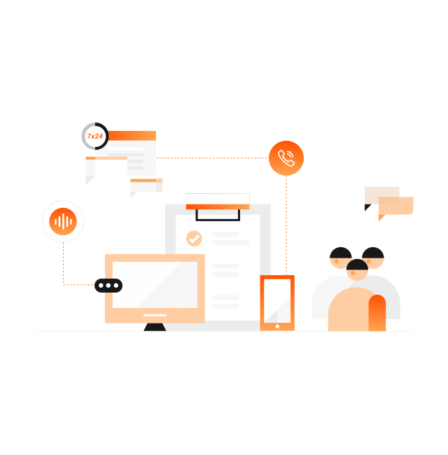用户拨打热线,提供自助语音服务; 用户在线咨询,提供7X24小时智能应答,问题未解决支持无缝转接人工或留言自动生成工单,并为人工客服提供辅助提效工具。