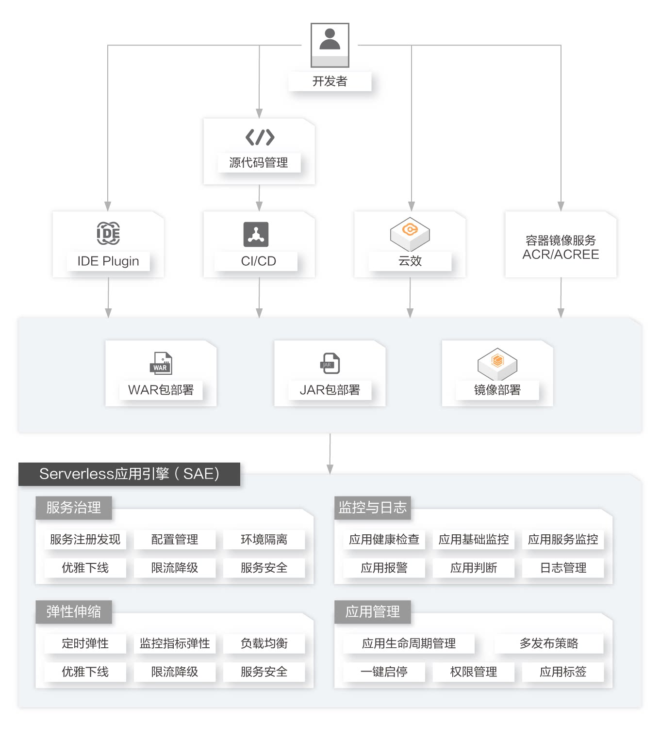 平台工程能力秒级完成从War、Jar代码包部署 SAE 应用,并支持自动 CD。同时也提供应用模板、CLI 命令行工具、组件库、成本管家等能力,帮助开发者们快速高效的交付应用程序。