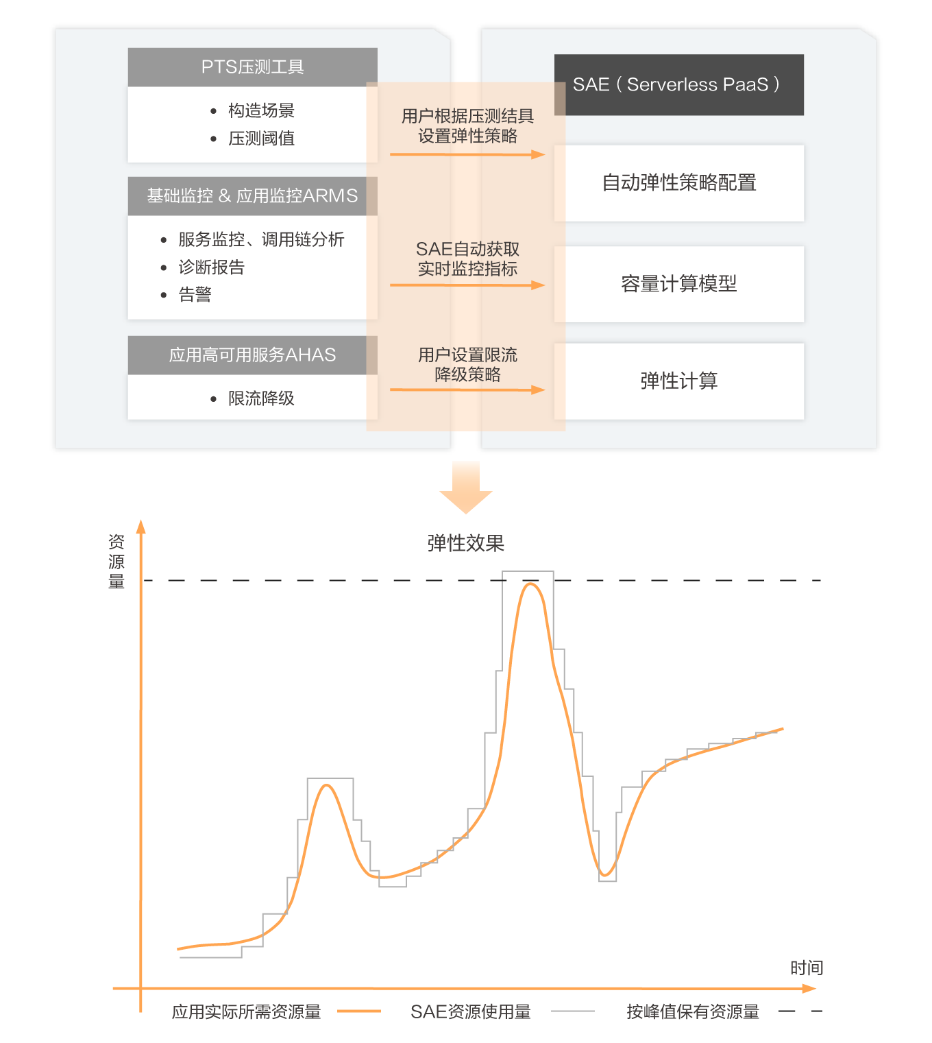 自适应弹性秒级弹性伸缩,根据负载自适应调整应用实例;支持白屏化配置多种弹性策略和弹性指标(如 QPS、RT、TCP 连接数等)。