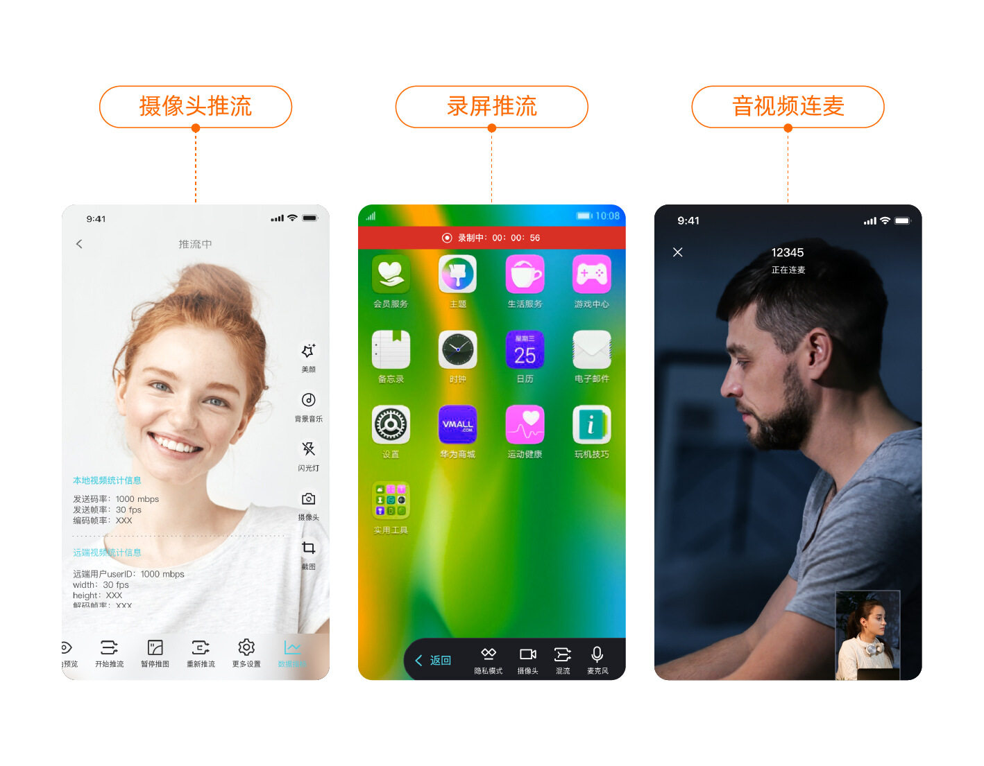 支持多端录制、变速、清晰度、屏比等多种拍摄设置;支持实时水印、实时滤镜、实时特效、实时美颜、合拍等多种录制方式;同时支持多路混音、回声消除、音频降噪等