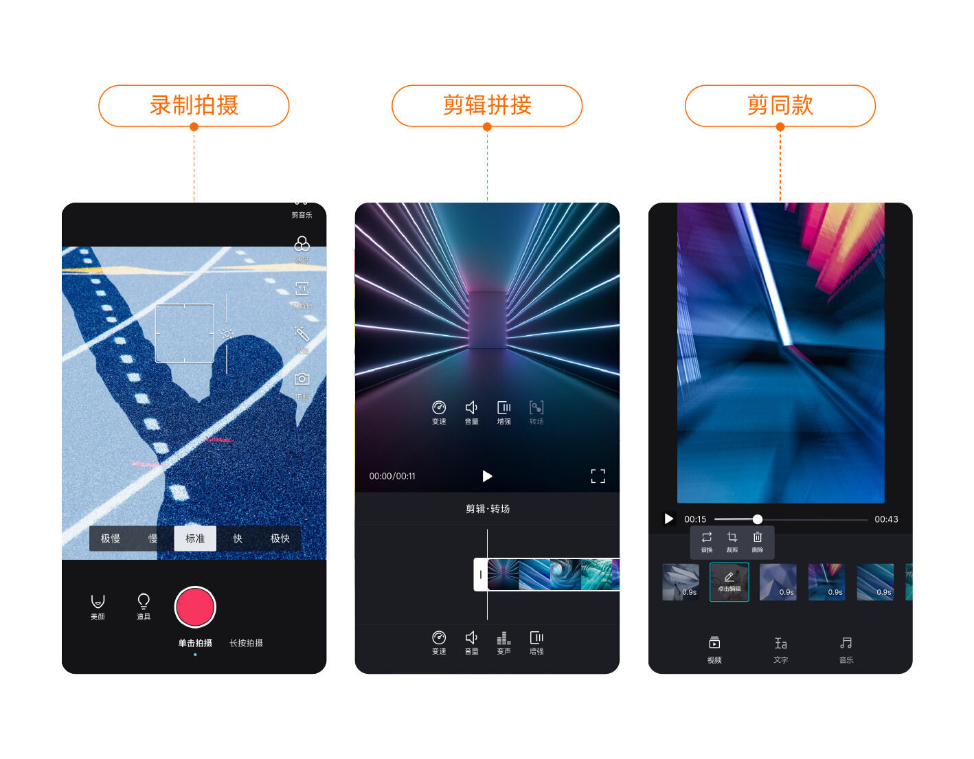 支持时间特效、画面调节、特效滤镜、转场涂鸦、音频变声等功能