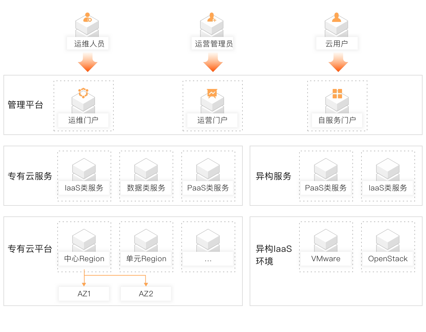 客户分级建设专有云,一般为总部云和区域云两级,区域自治管理,总部对区域独立专有云的集中管控能力。