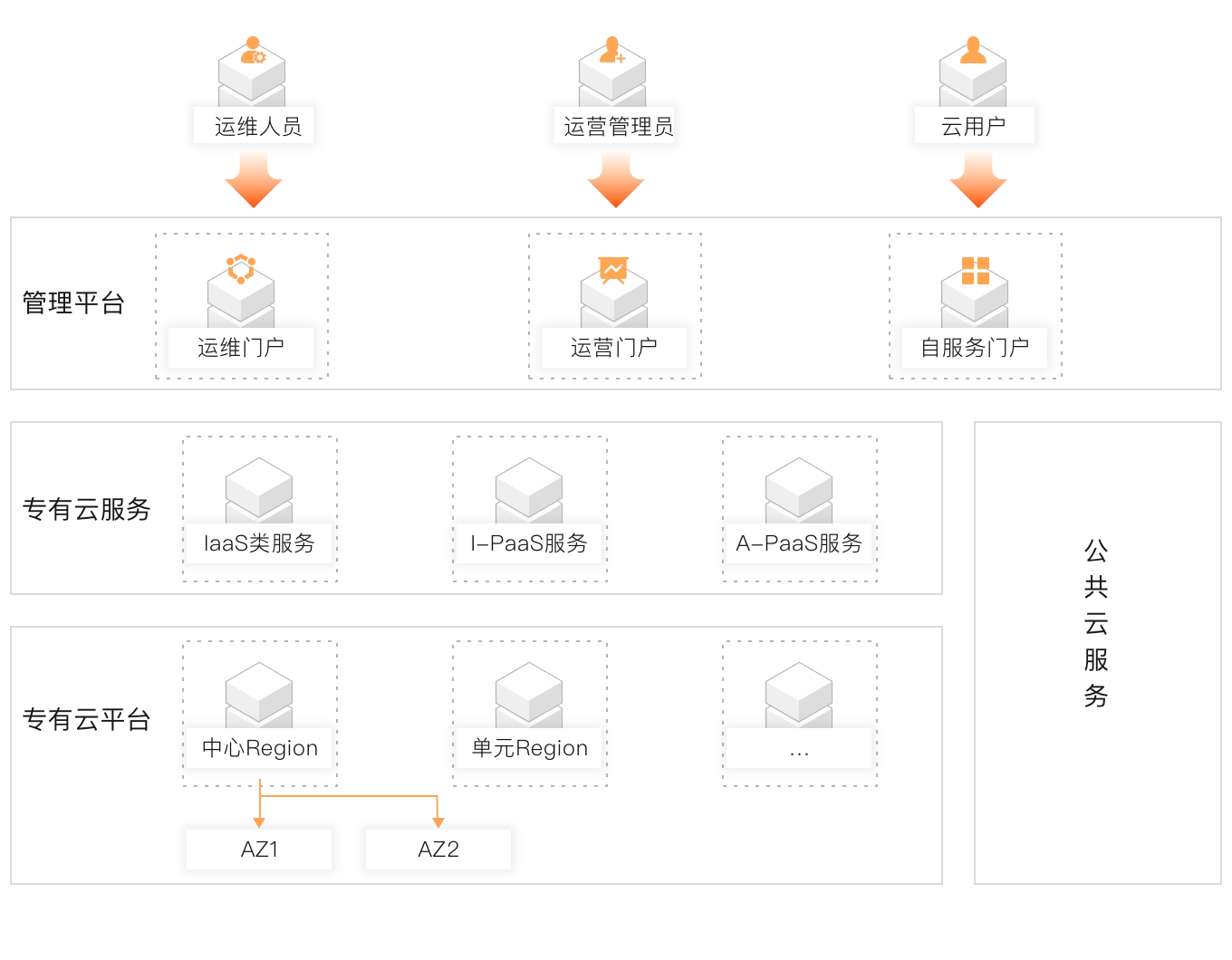 客户分级建设专有云,一般为总部云和区域云两级,区域自治管理,总部对区域独立专有云的集中管控能力