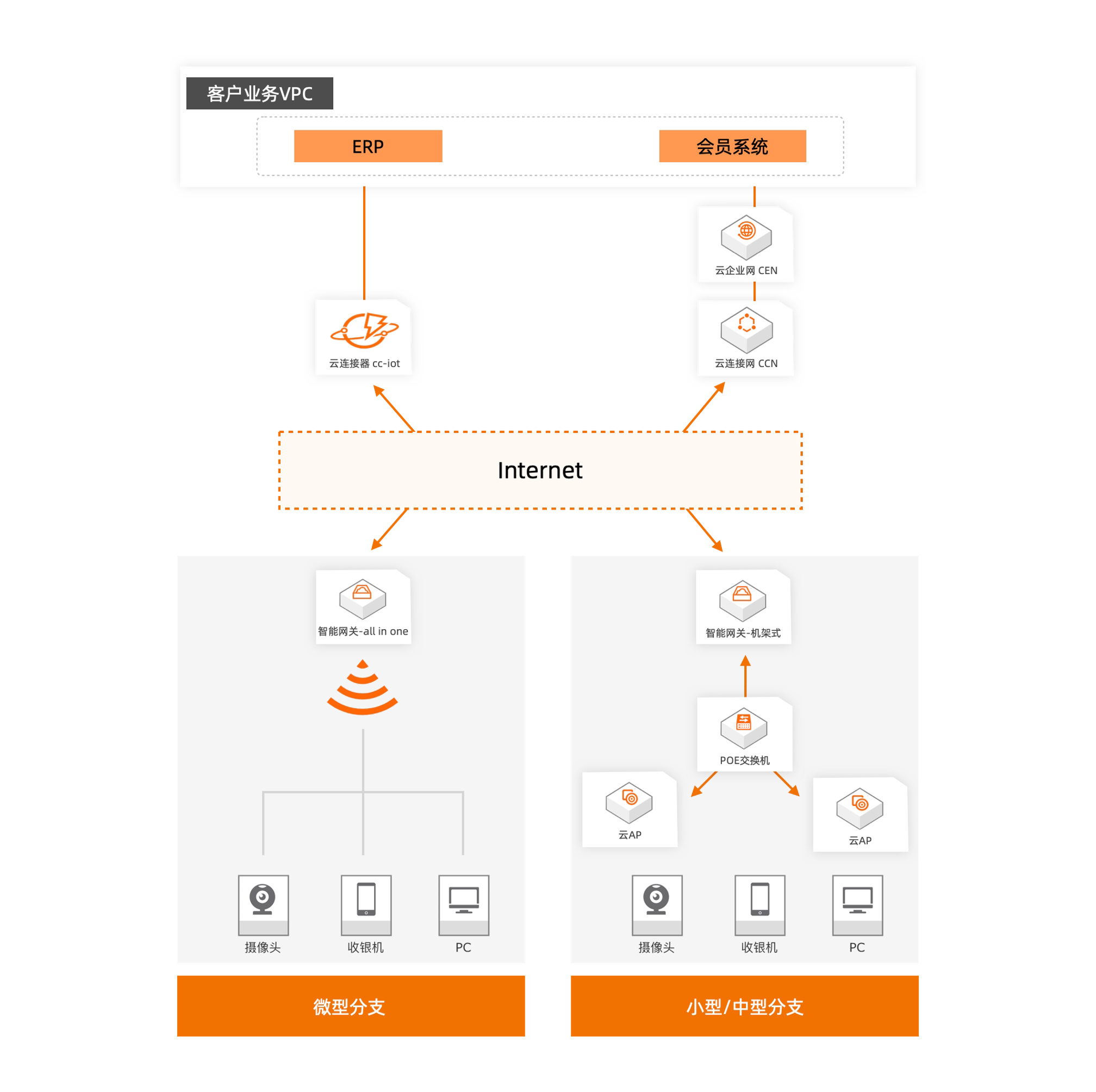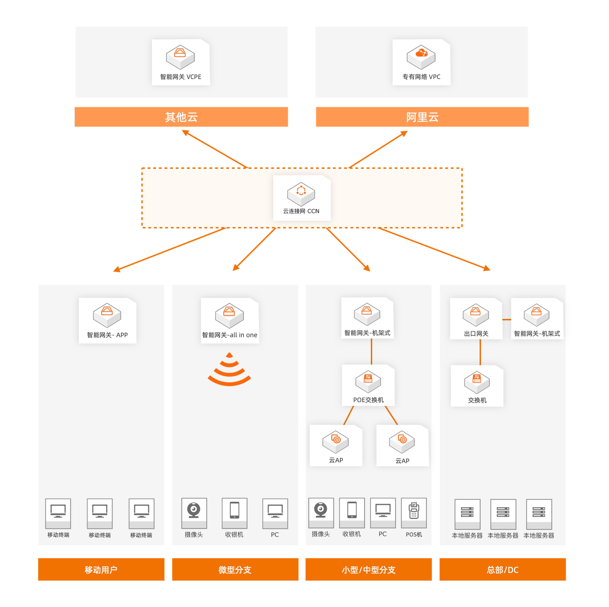 线下多个分支之间,分支和总部之间,分支和IDC/私有云之间,分支和公有云之间,通过智能网关快速就近接入阿里云POP点,构建安全稳定的传输网络。