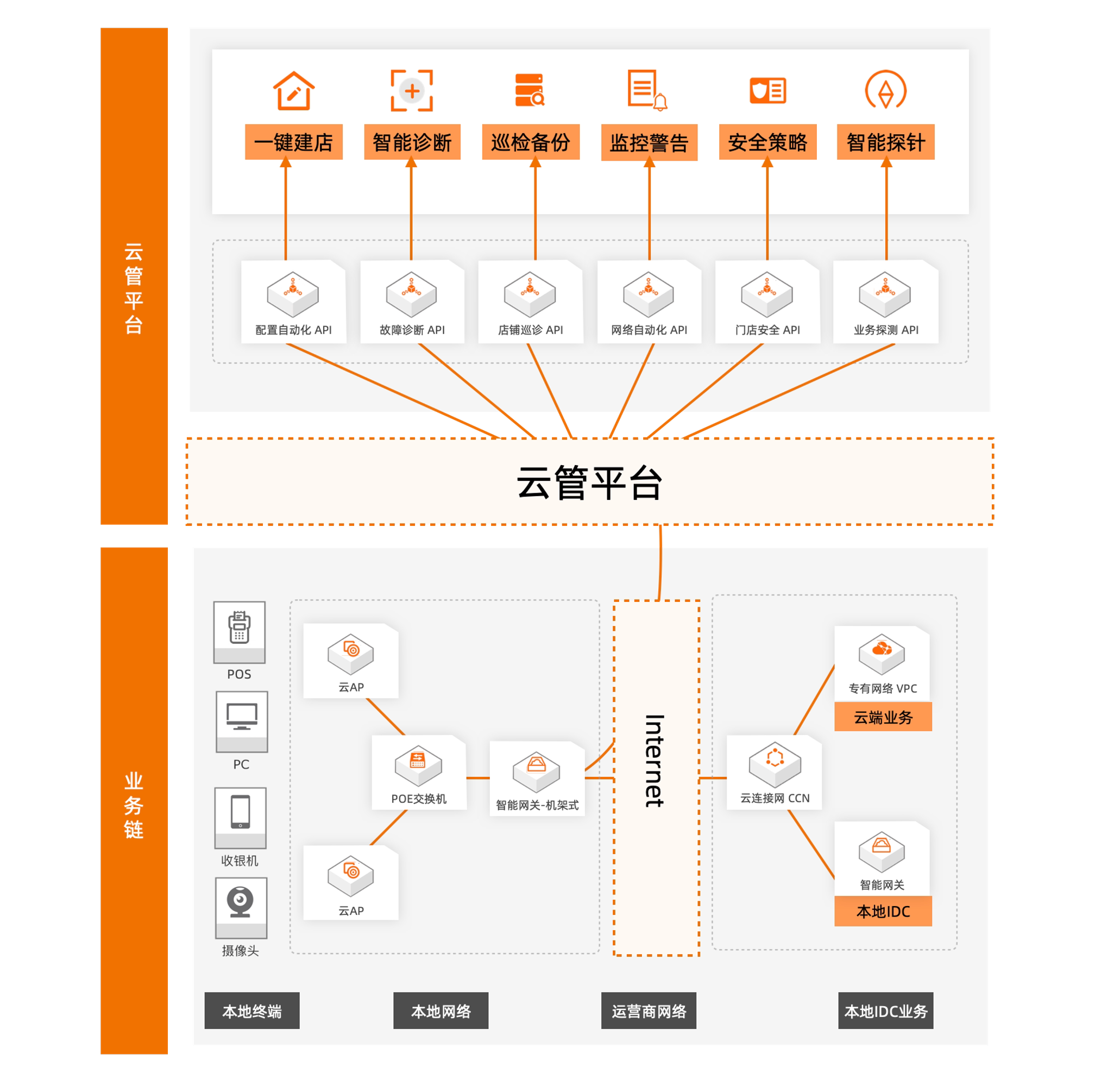 上探应用,下探终端,面向业务智能的运维企业本地网络、云上VPC网络、本地和云之间互联网络。