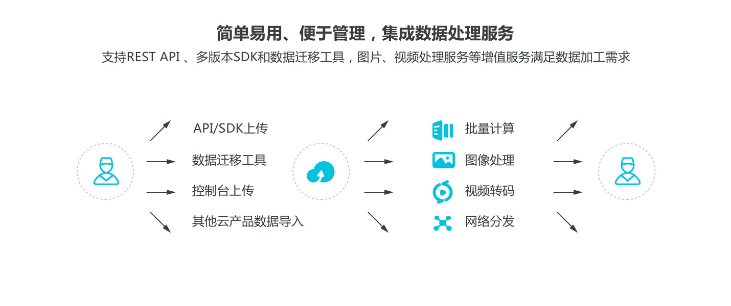 上传文件到OSS后,您可以配合媒体转码服务(MTS),图片处理服务(IMG),批量计算服务、离线数据处理服务(ODPS)充分挖掘您数据的价值,引领从IT到DT的变革。