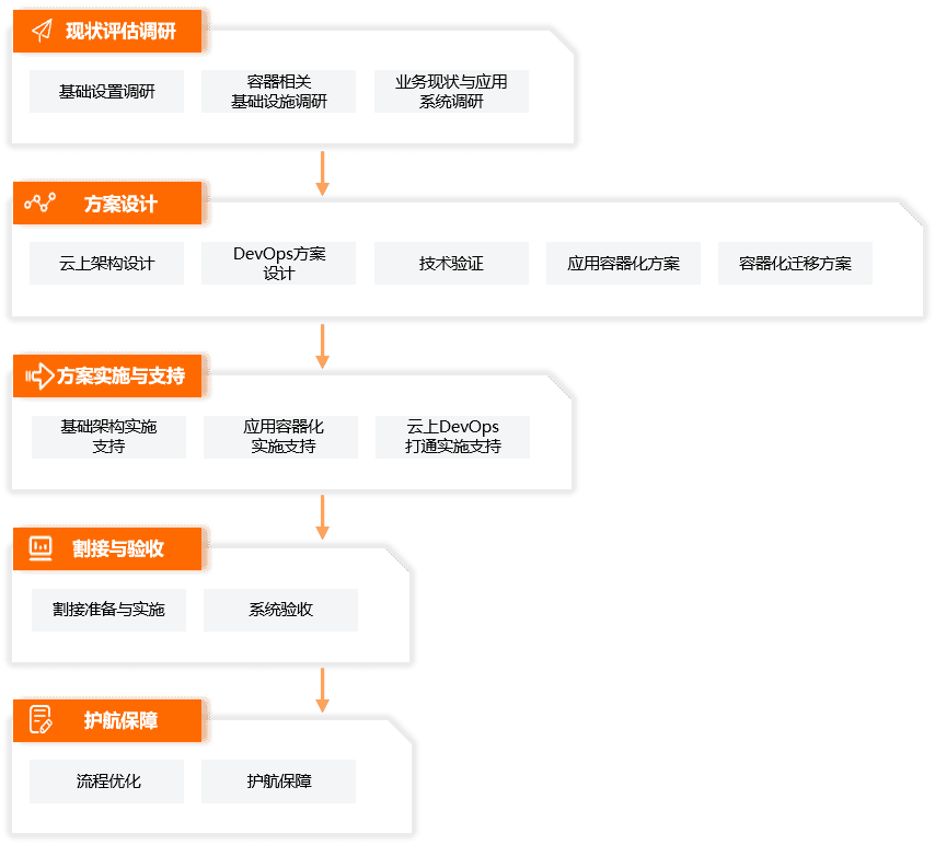 该服务内容包括:当前用户业务现状分析、技术架构分析、容器化核心需求理解、进行容器化设计,技术选型与实践落地等服务。