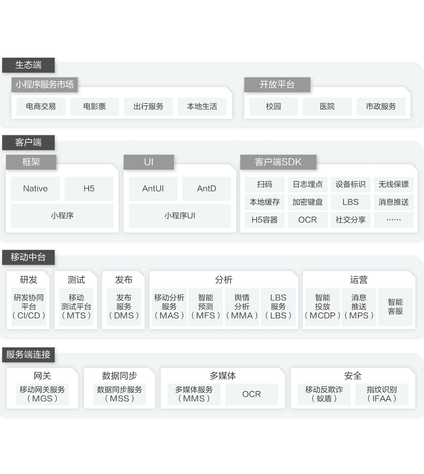 mPaaS(Mobile PaaS)为 App 开发、测试、运营及运维提供云到端的一站式解决方案,有效降低技术门槛、减少研发成本、提升开发效率,协助企业快速搭建稳定高质的移动应用。