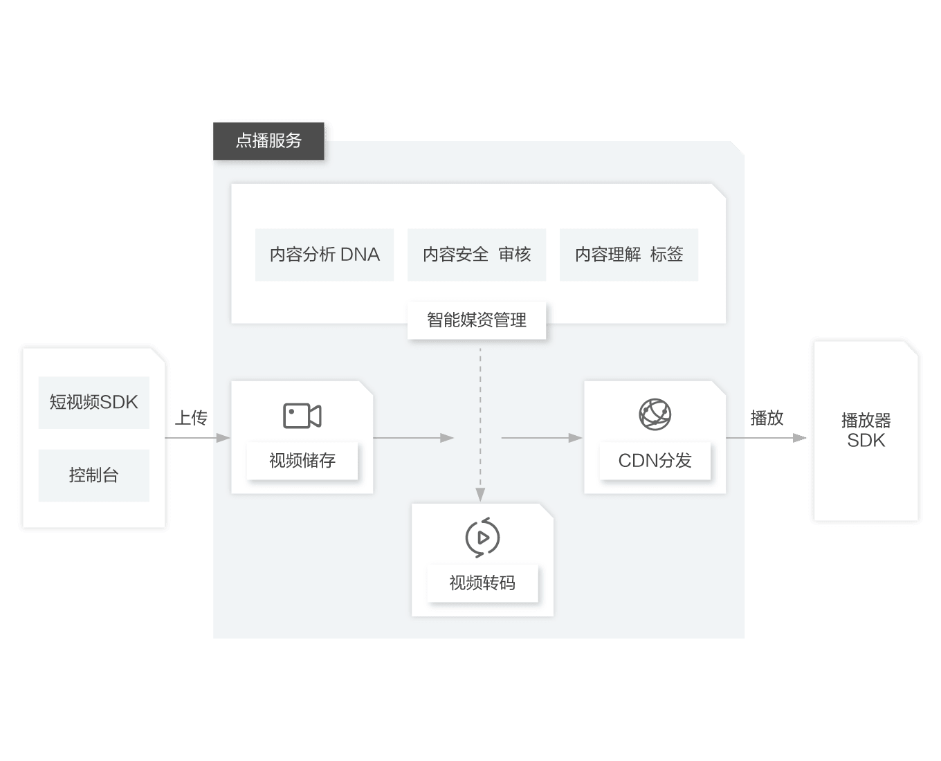 通过短视频 SDK、或点播客户端等,将媒资内容上传并存储到点播服务。