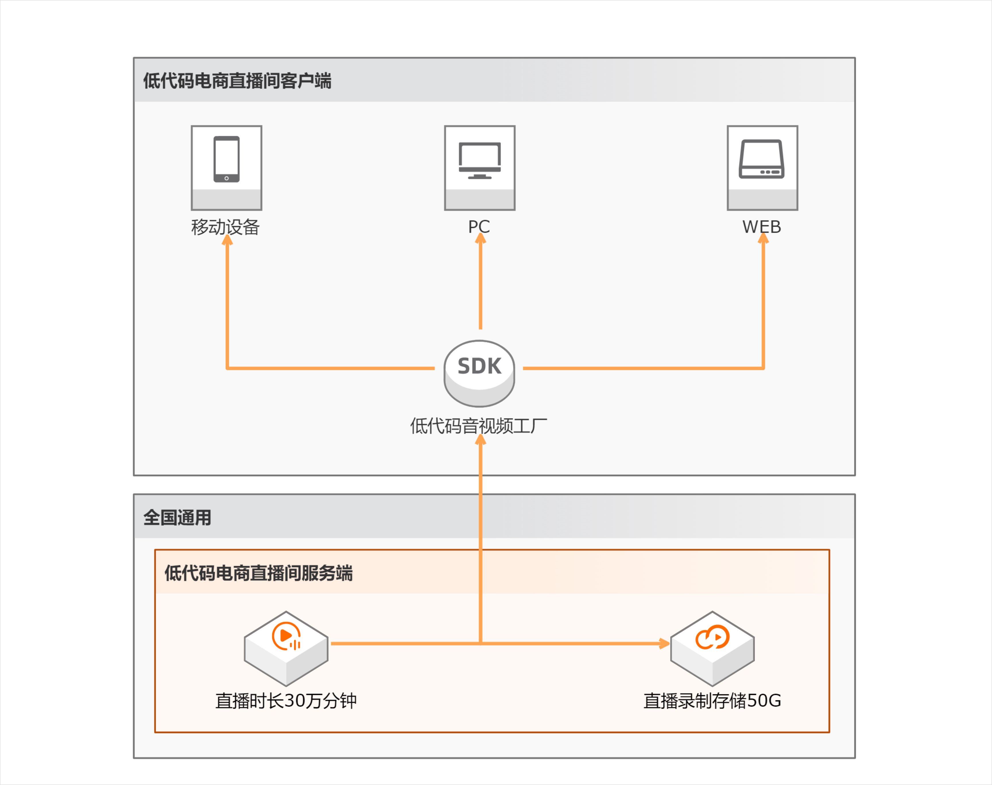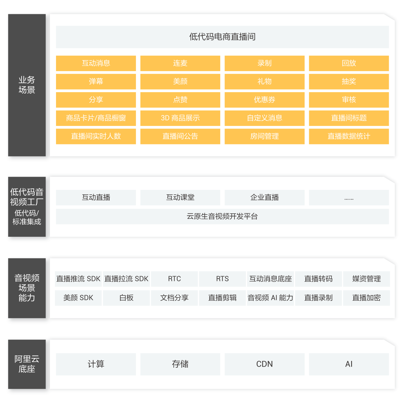 基于阿里云云原生、音视频、AI 智能算法和网络等先进技术,通过低代码方式接入,帮助企业快速完成在自有 APP、小程序、网站等平台的私域电商直播间的搭建。其易接入且强扩展的特性,既可以满足企业定制需求,又可以降低时间成本,快速验证直播卖货商业模式。