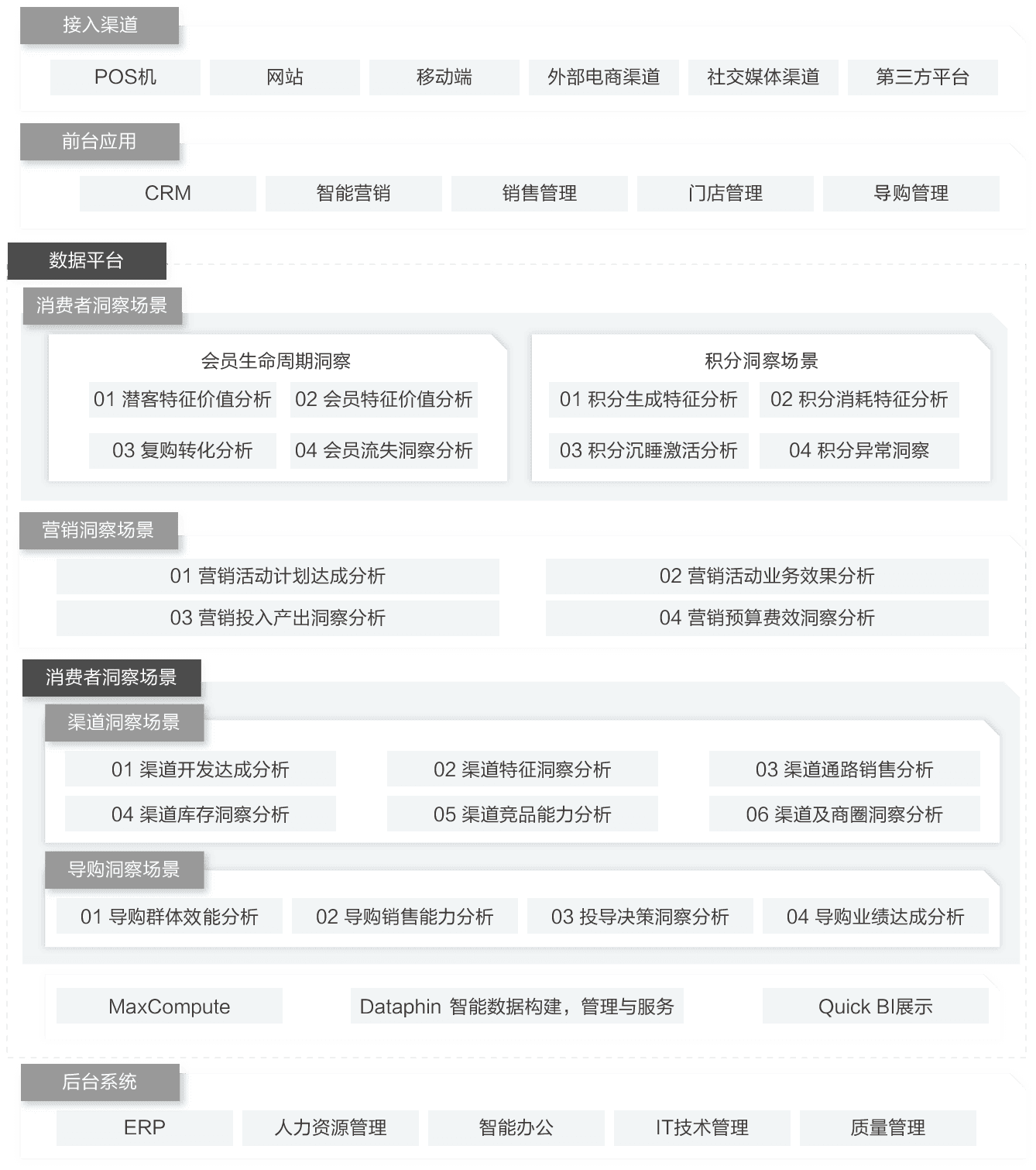基于阿里云数据中台构建公共数据资产层,按业务领域划分数据域,建立数据模型,业务洞察。