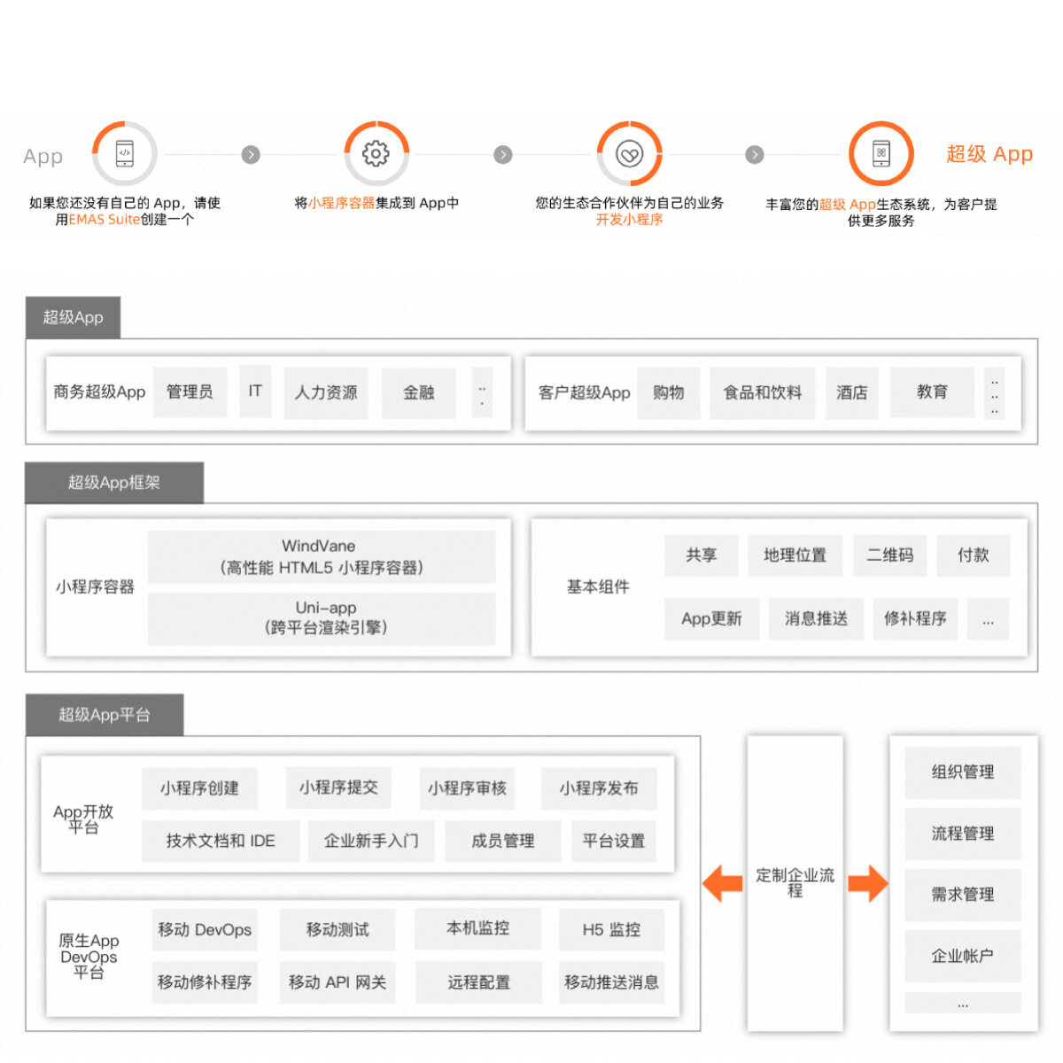 该解决方案提供了框架和平台,支持超级App和小程序在整个App生命周期中的开发、测试、DevOps、维护和各种操作。