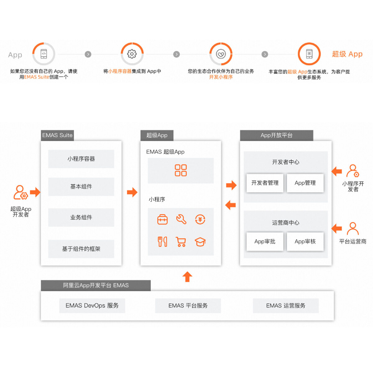 该解决方案提供了各种功能,可帮助您构建具有丰富生态系统的超级App,包括用于App基础设施和业务功能的组件、用于运行小程序的容器以及用于 DevOps 和运营的服务。