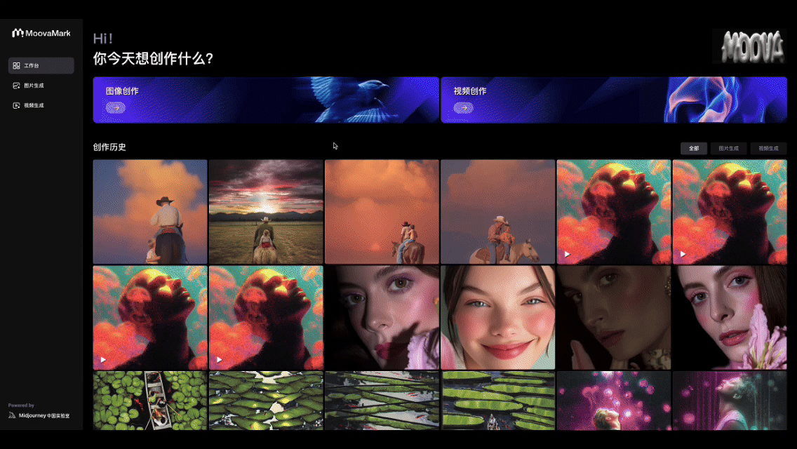 本方案基于 Function AI 构建 Web 服务,集成了Midjourney中国实验室提供的官方开放接口,打造一站式AI创意生产平台。平台支持图像与视频内容生产、二次编辑及素材管理等能力。