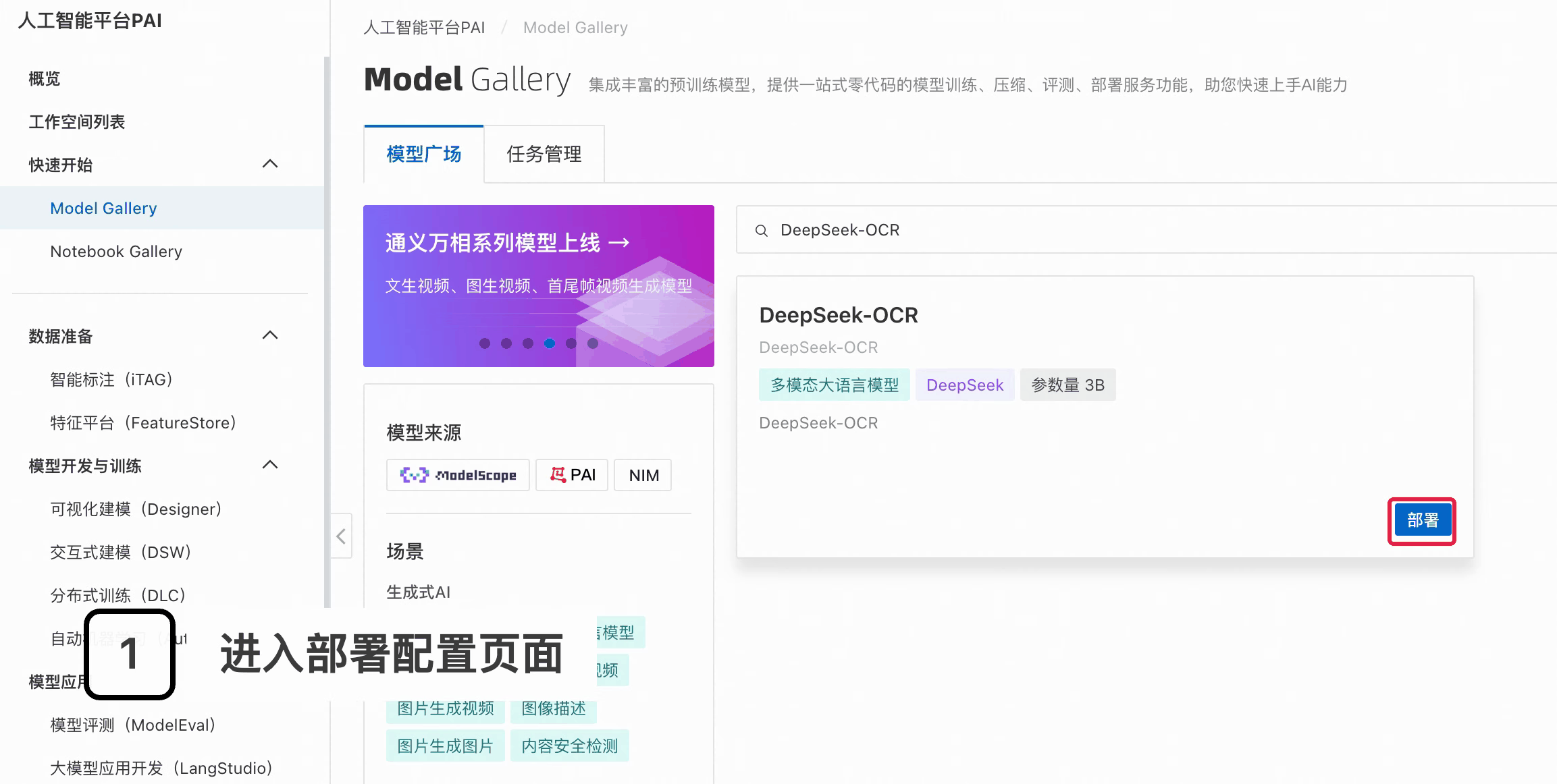 本方案为您介绍如何通过人工智能平台 PAI 的模型库 Model Gallery 实现 DeepSeek-OCR 模型的云上部署。人工智能平台 PAI 为开发者提供从数据标注、模型开发到训练部署的全链路 AI 研发服务。其 Model Gallery 集成多领域当前最佳模型(覆盖LLM、AIGC、CV、NLP等),通过低代码/零代码界面支持模型训练、压缩、评测、部署全流程,显著提升开发效率。