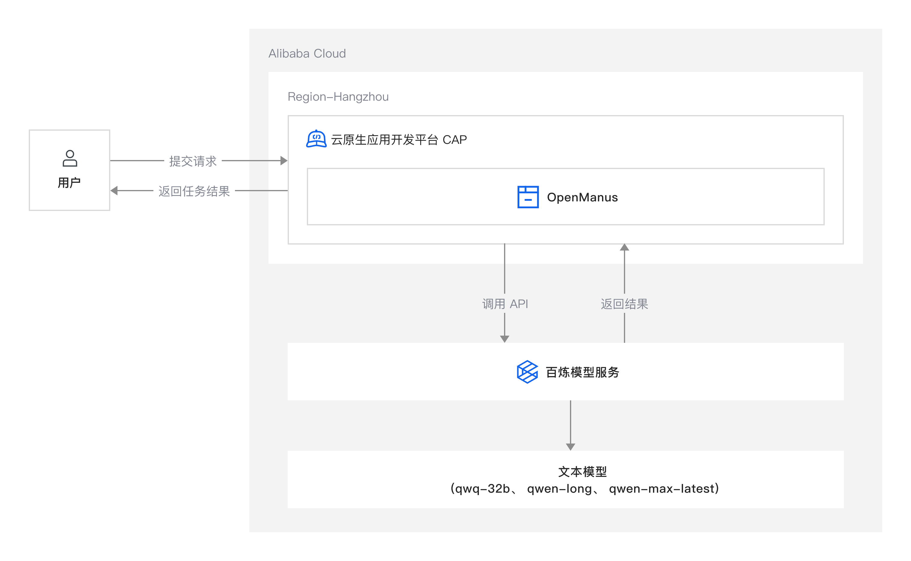 本方案采用函数计算云原生应用开发平台 CAP 来构建 Web 服务,并采用函数计算平台为其提供计算资源。结合阿里云百炼的模型服务能力,采用qwen-long实现任务规划与工具的选择及调用。同时,依托qwq-32b和qwen-max-latest来支持思考过程和联网搜索功能,以实现 OpenManus 服务的高效部署。用户访问 Web 页面发起请求,OpenManus 将根据用户的输入完成任务,最终处理结果返回给用户。