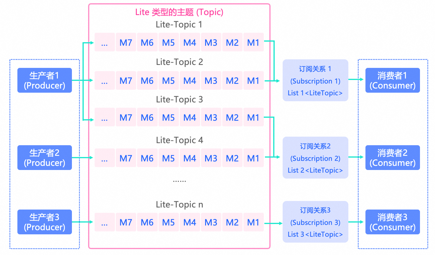 高性能订阅能力:每个消费者可以订阅万级数量的LiteTopic资源。