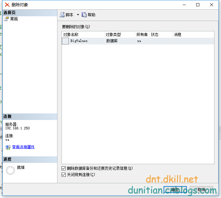 异常处理汇总-数据库系列 http://www.cnblogs.com/dunitian/p/4522990.html 以前刚学数据库的时候比较苦恼这个问题,今天删除的时候又看见了,正好一起记录一下: 图形化方法: 命令行方法: use master go declare @dbname sysname set @dbname = 'BigValuesT...